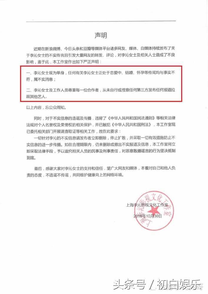 看李沁工作室发出的声明中也是明确表示,李沁目前还是处于单身状态,关于网友众多“恋爱中、结婚、怀孕”等等传闻均是不实消息。并且李沁工作室也是表明态度,希望传播不实消息的网友能够及时删除,如果仍然继续扩散,将会采用法律手段。