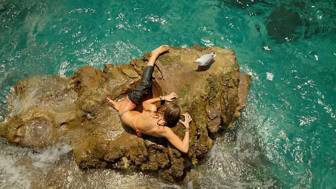 5.经过与鲨鱼一番纠缠,女主拼死游到了一块礁石上。
