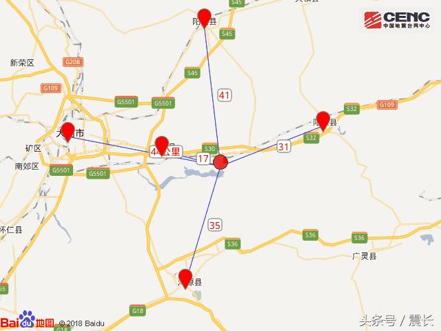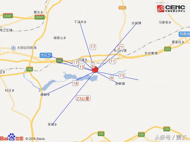 震中距大同县17公里、距阳原县31公里、距浑源县35公里、距阳高县41公里、距城区44公里,距大同市44公里,距呼和浩特市196公里。
