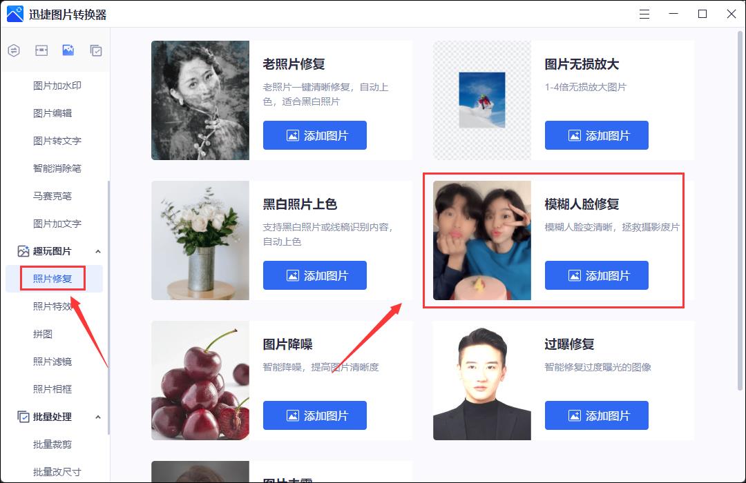 第一步:点击【照片修复】,找到【模糊人脸修复】,其他修复就小伙伴们自信尝试一下,按照提示一步一步进行,也是非常简单的!