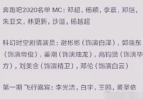 近日,有综艺类博主在网上发布疑似新一季跑男成员的名单。上面写着:邓超、杨颖、李晨、郑恺、朱亚文、林更新、沙溢、杨超越共八人。