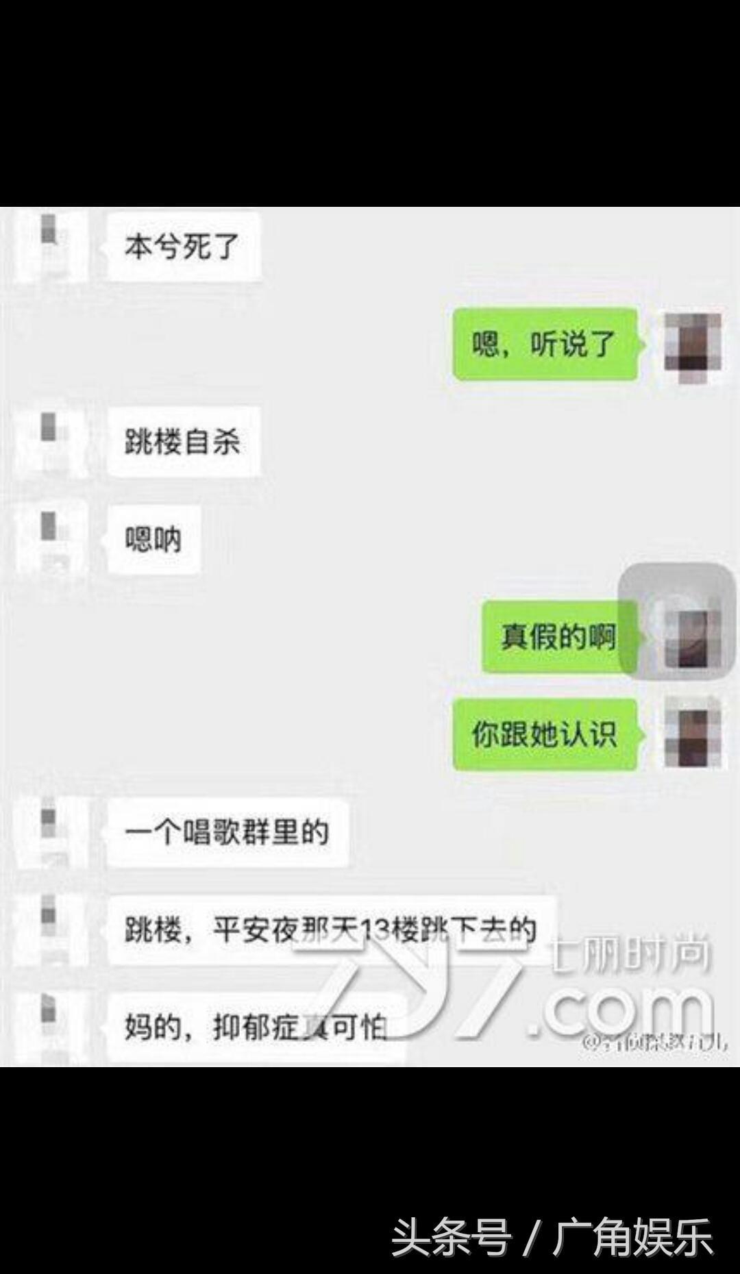网传的一张聊天截图,称本兮在平安夜晚上选择从13楼跳下去结束自己的生命。