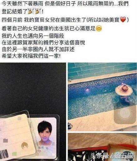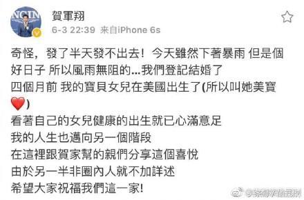 贺军翔爱妻首曝光 台湾艺人贺军翔今年六月突然发文宣布登记结婚,并称女儿已经在美国出生4个月。