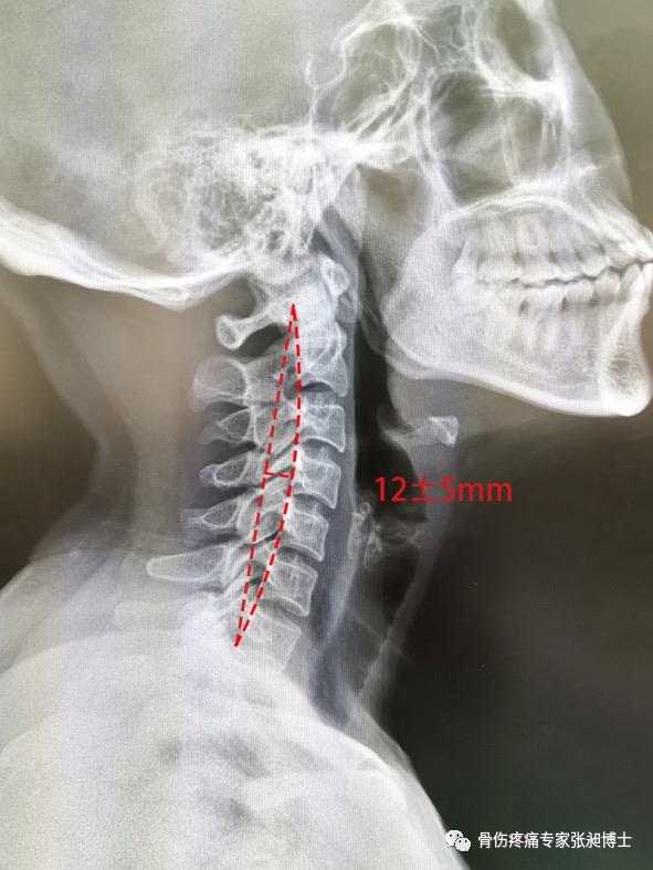 在颈椎X线的侧位片上,沿枢椎的齿状突后缘最高点与第七颈椎后下缘作一直线,将颈椎椎体后缘连一弧线。直线与弧线之间最宽处的距离正常值为12mm±5mm。