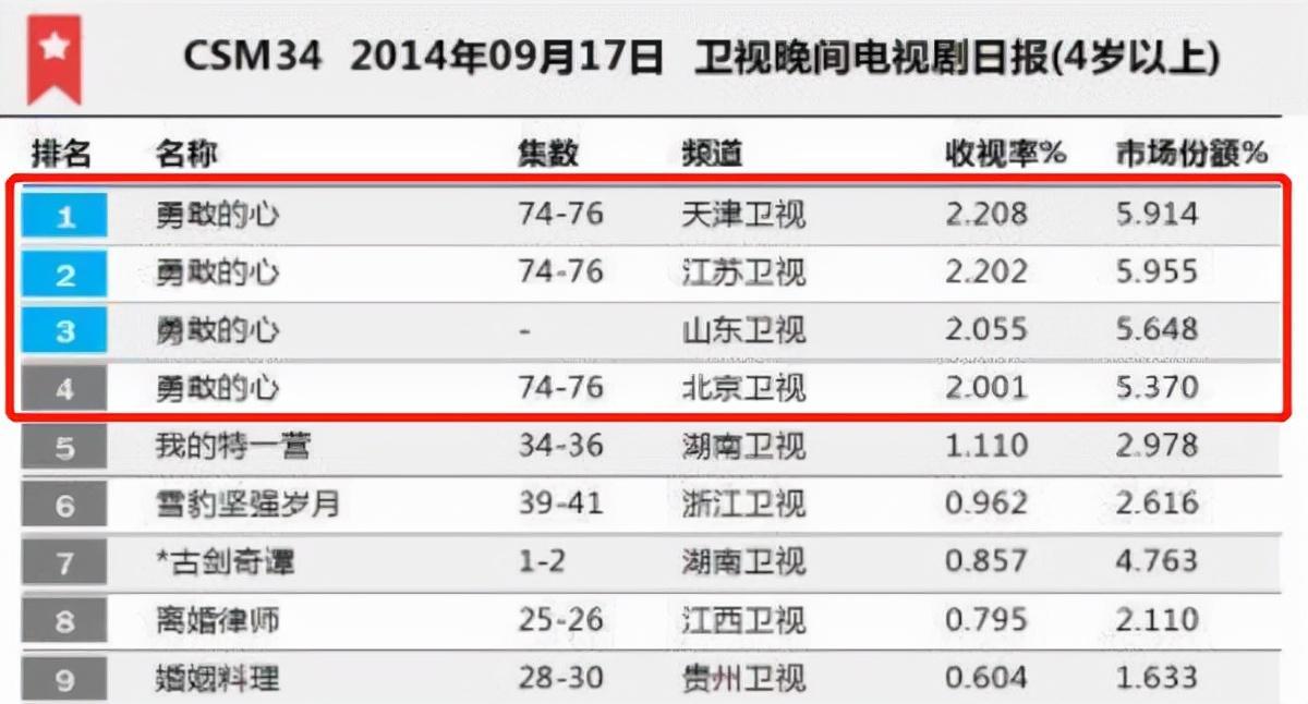 2014年,由郭靖宇执导的年代剧《勇敢的心》在北京、江苏、山东、天津四大卫视同时开播。这部剧播出后收视一路飙升,甚至解锁了四大卫视收视率同时破2的成就。随后,央视又二轮播出,依然取得了不错的收视成绩,可见当年这部剧有多火爆。
