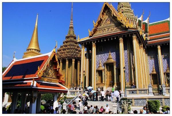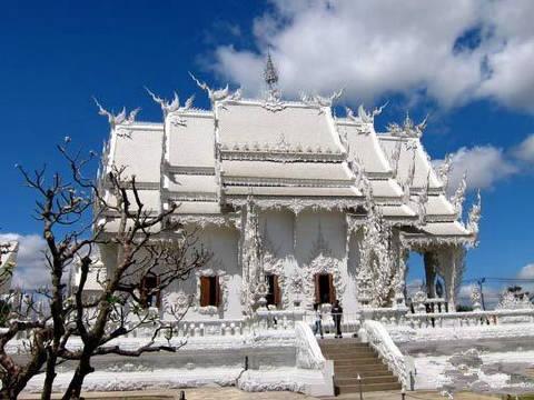 这座特别的泰国佛寺是由泰国的知名艺术家Charlermchai Kositpipat出钱出力、设计建设的。白色的建筑物倘徉在蔚蓝的天空,堪称一件美丽的艺术作品。 这栋充满现代化风格的佛寺庙堂外部装饰着镜子的碎片,山形窗边则装饰着Nagas(多头蛇和幽冥世界之神只) 以及大象和伞等形睢炔坑Khositphiphat手绘的巨幅佛像壁画。