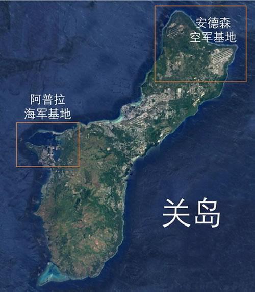 关岛位于西太平洋马里亚纳群岛最南端,距夏威夷大约7000公里。关岛是美军重要的军事基地,面积549㎞2,美军基地占地约全岛的1/4左右,被称为美军在太平洋上“不沉的航空母舰”。关岛现有人口17.3万,关岛驻扎1.9万名美国士兵。由于这里距亚洲大陆直线距离高达数千公里,美国在亚洲地区的“敌国”很难开展有效还击行动。美军在关岛的军事用地约27000英亩(包括已归还民用的部分),约占关岛陆地总面积的20%。关岛的安德逊空军基地是美国在太平洋地区的一个重要战略空军基地。美海军在阿加尼亚设有航空站,在阿卜拉港有潜艇基地。美海军陆战队和海岸警卫队在岛上有驻军。1996年,岛上有美国空军人员2100人,海军人员4600人。