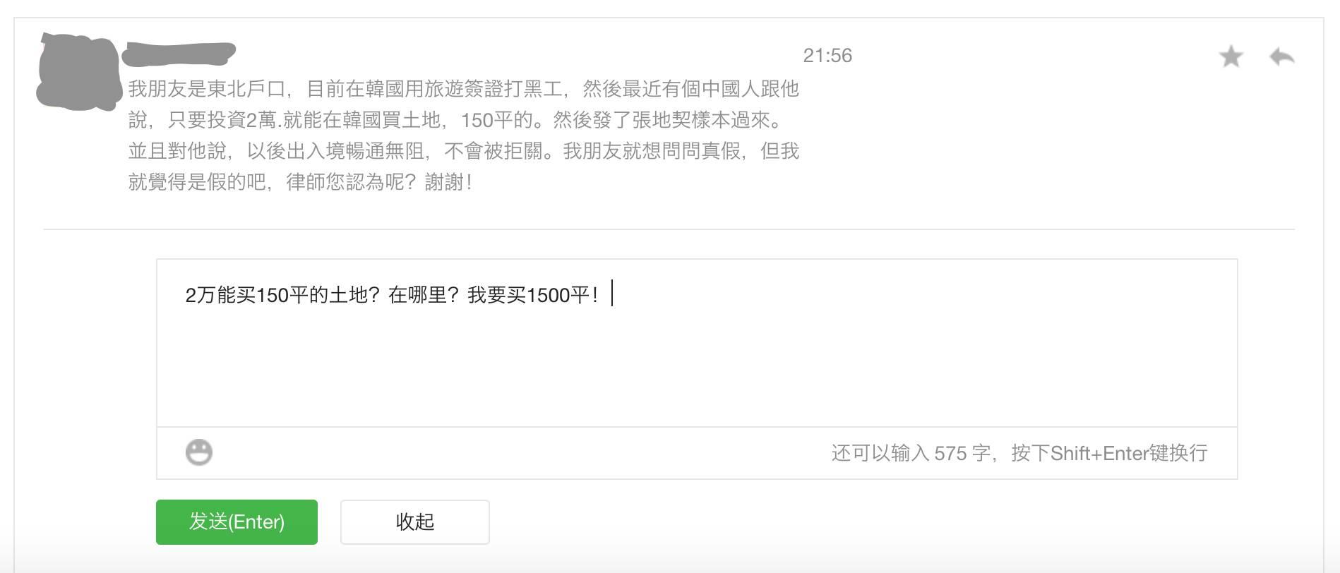 “我朋友是东北户口,目前在韩国用旅游签证打黑工,然后最近有个中国人跟他说,只要投资2万,就能在韩国买土地,150平的。然后发了张土地合同样本过来。并且对他说,以后出入境畅通无阻,不会被拒关。”这是昨天晚上有一个人向本平台发过来的消息。