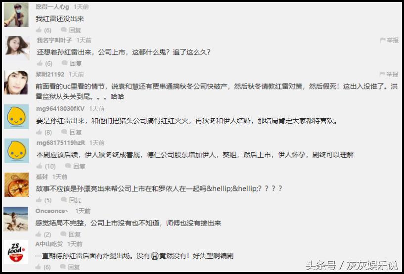 事情发展到这里虽然大结局了,但网友纷纷表示,这是个什么结局啊,说好的公司上市呢?说好的孙红雷呢?难道孙红雷就这样被判了一个无期徒刑吗?还有网友说,不是大结局是两个人结婚了咯,现在就这样一个相拥而吻就没有了,这个结局也太烂了吧。