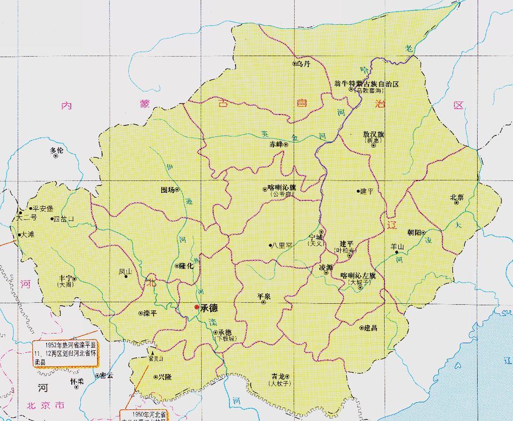 热河省面积173960平方公里,在民国时期,下辖20个县和20个旗,新中国成立后调整为下辖2市16县4旗,分别为(承德市,赤峰市,承德县,赤峰县,凌源县,平泉县,建昌县,建平县,宁城县,围场县,乌丹县,青龙县,隆化县,丰宁县,滦平县,兴隆县,北票县,朝阳县,喀喇沁左旗,喀喇沁右旗,敖汉旗,翁牛特旗。)1953年总人口为5160822人,其中汉族占93%,蒙古族占3.5%,满族2.8%剩余为其他少数民族。