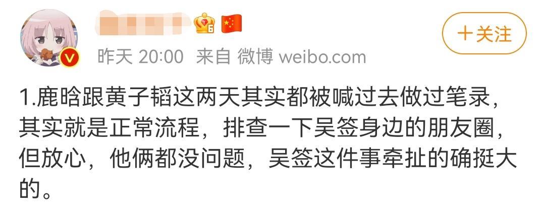 在昨天,又有知名娱乐博主爆料,吴亦凡事件进一步的发酵,现在更是连累了一些圈内的好友,当中指出鹿晗和黄子韬也被叫去问话,但也只是一个正常流程,做个笔录而已,他们二人并没有问题,可见已经开始排查男方的朋友圈了。
