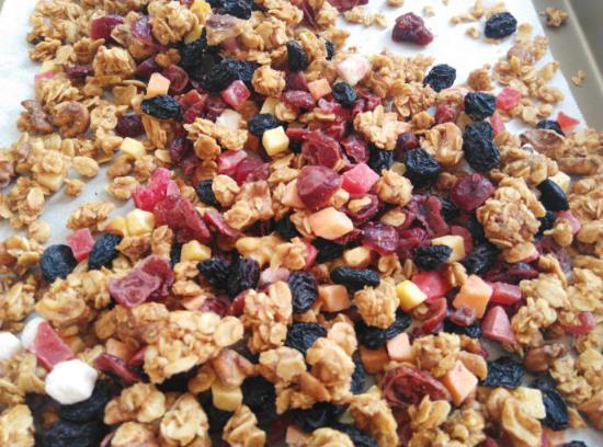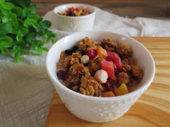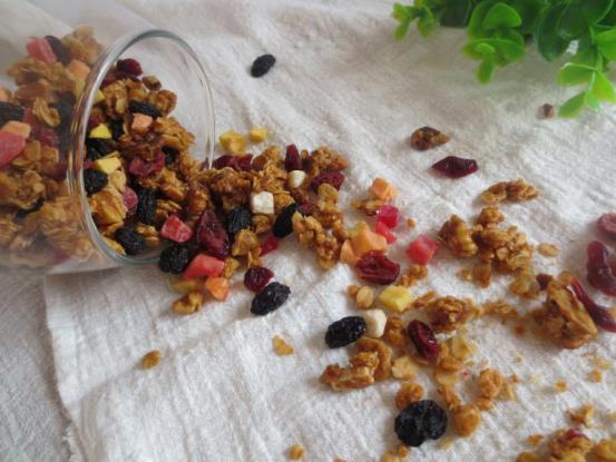 9.烤好的麦片放凉以后放入水果干,蔓越莓,黑加仑,混合均匀
