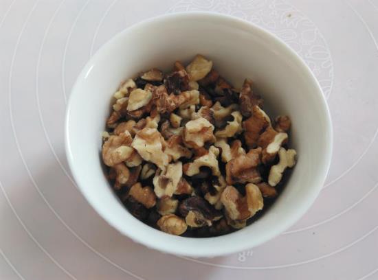 2.核桃去壳,烤箱200度烤5分钟,烤好后分成小颗粒