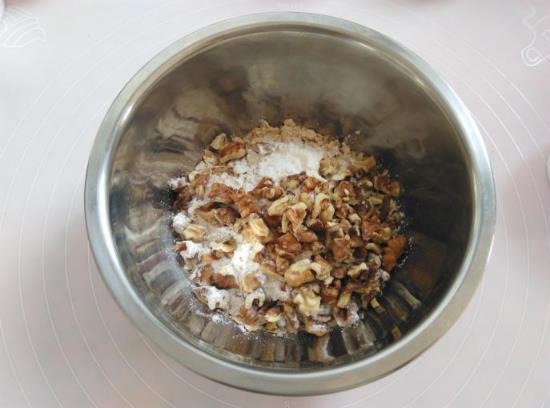 3.取一只干净的盆子,放入快熟麦片,低筋面粉,核桃仁颗粒,混合一下