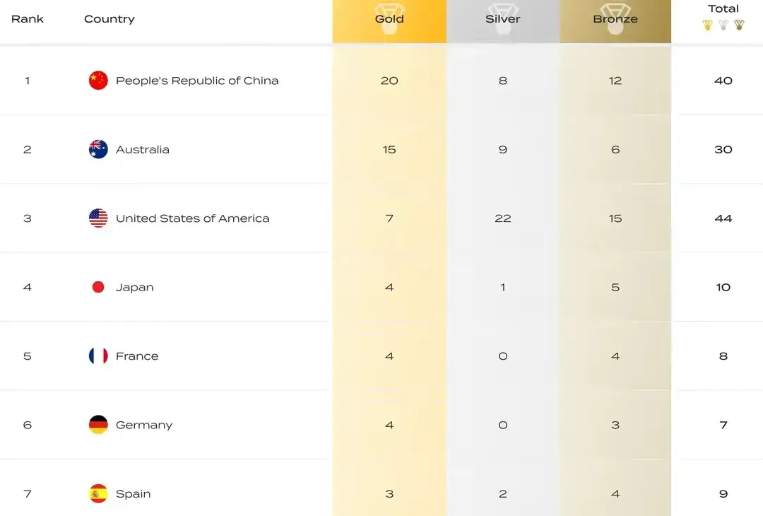 中国队20金(跳水12、花游3、游泳5)获得金牌榜榜首,澳大利亚15枚金牌排名第二。美国队7枚金牌排名第三。