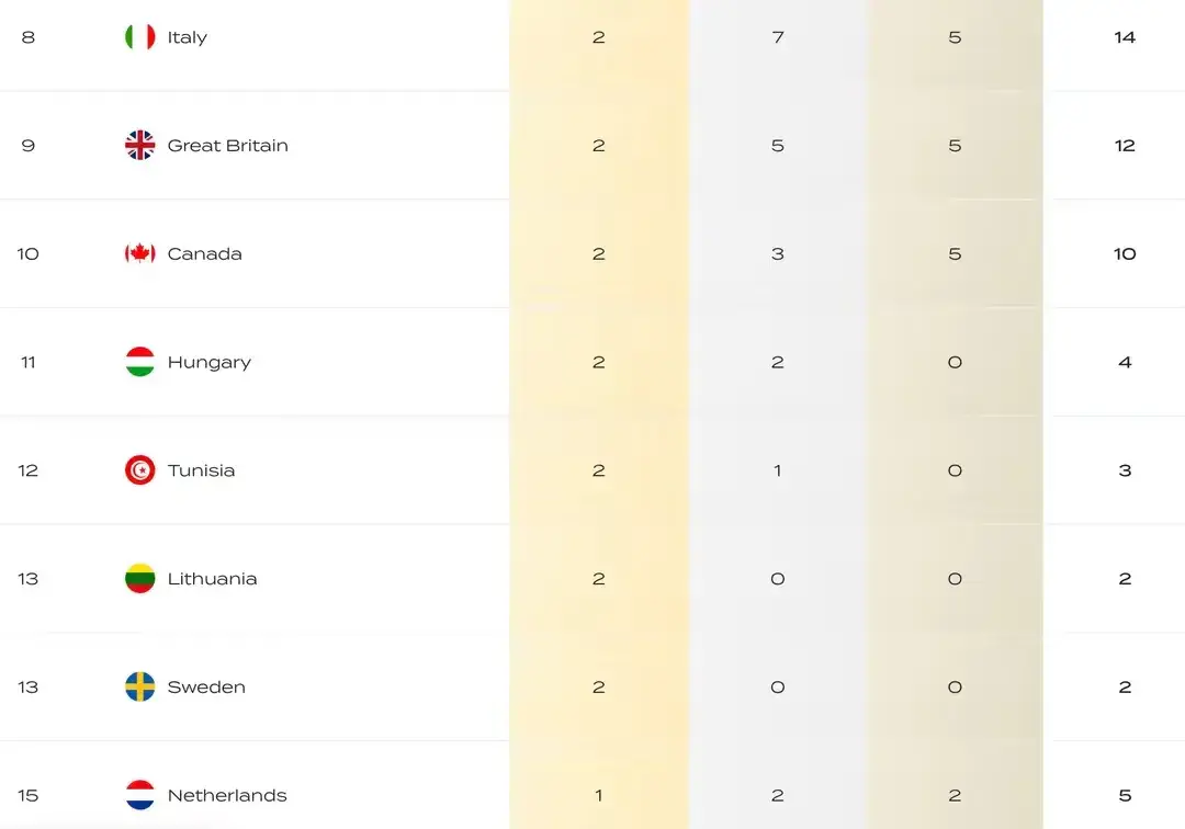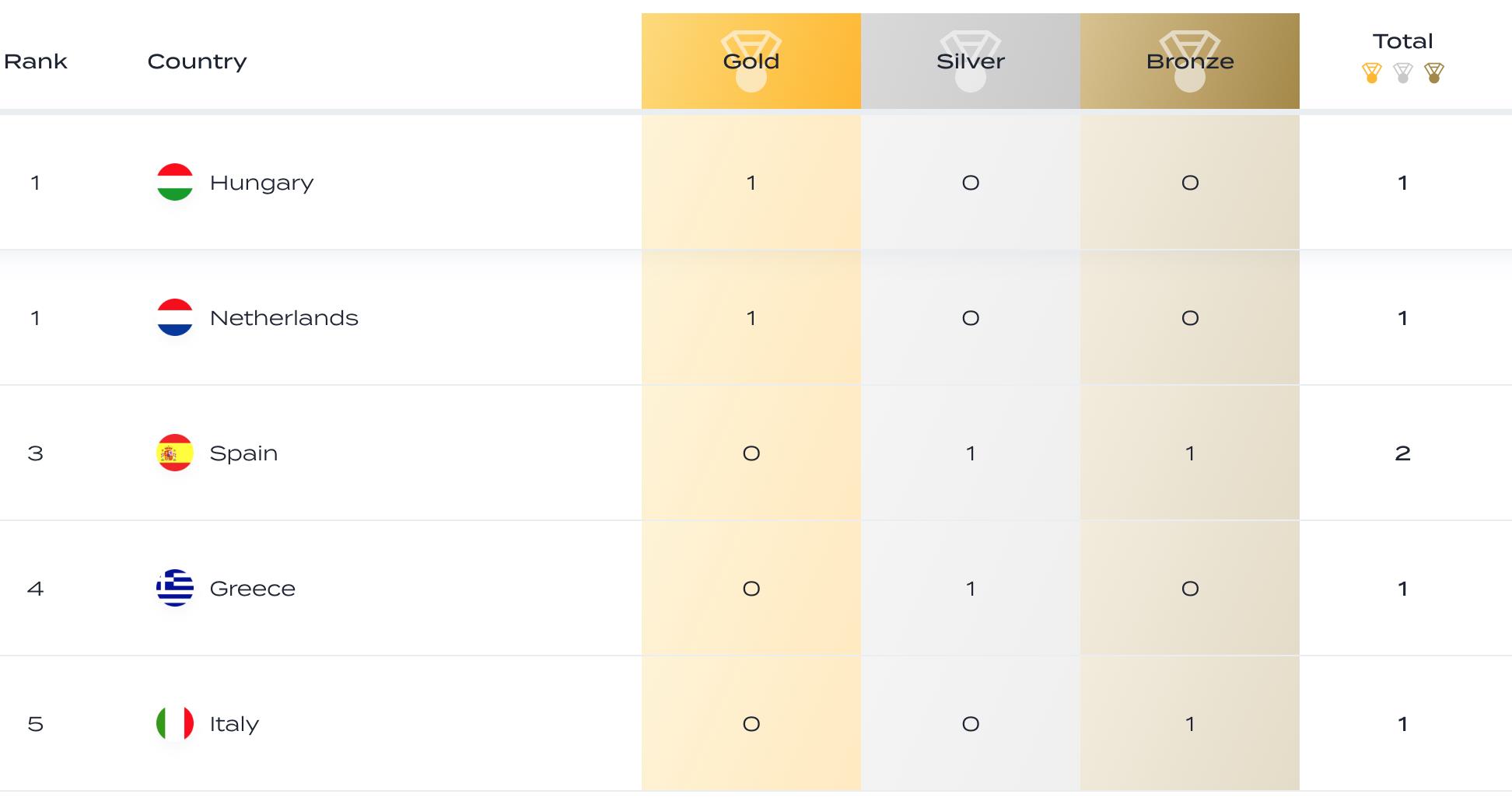 匈牙利1金,荷兰1金并列榜首,西班牙1银1铜第二,希腊1银获得3。