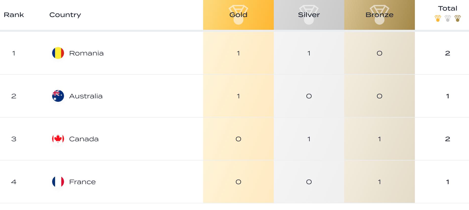 罗马尼亚1金1银荣获榜首,澳大利亚1金获得第2,加拿大1银1铜获得第三。