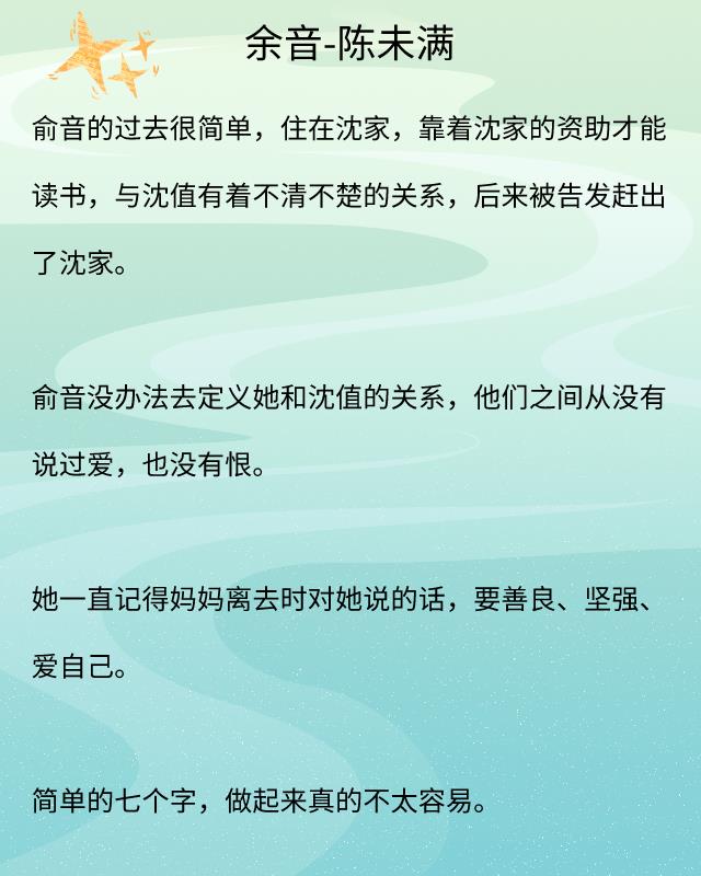 《余音》讲述的是俞音与沈值的爱情故事,是淡然帮佣之女与高冷深情少爷的破镜重圆。