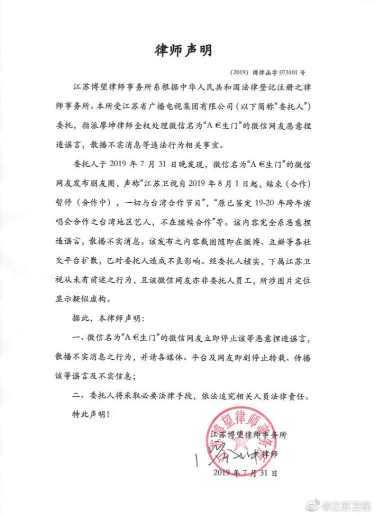 对此,江苏卫视刚刚在官方微博上发布律师声明,该朋友圈截图系“恶意捏造谣言,散播不实消息”,发布该内容的微信网友并非江苏卫视员工,所涉及的“江苏广播电视台”图片定位也疑似虚构。声明指出,请各方停止传播不实信息,江苏卫视将采取必要的法律手段,依法追究相关人员的法律责任。