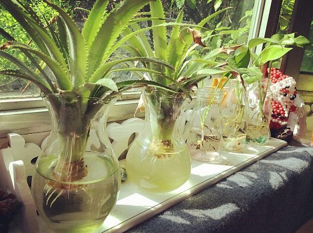 水培时,把菠萝头放在水中浸泡,而且水也不宜过深,水面尽量不要超过叶片。