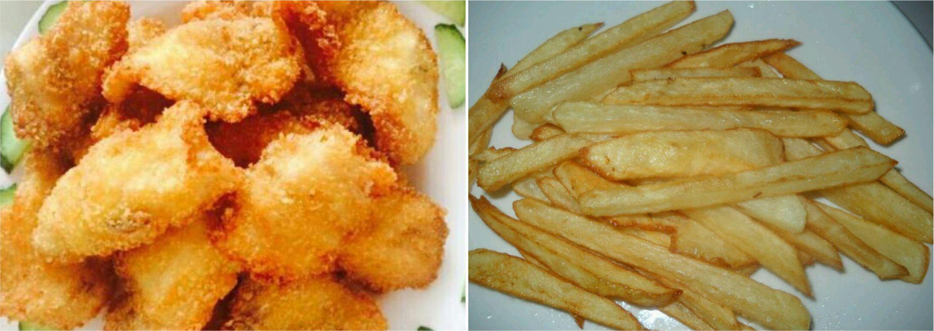5、热锅起油,油要多一点,油烧至七成温度时转中火,把鱼片分批放进去炸,大约30秒,双面金黄即可捞出控油;然后放进土豆条,也炸至金黄捞出控油备用;