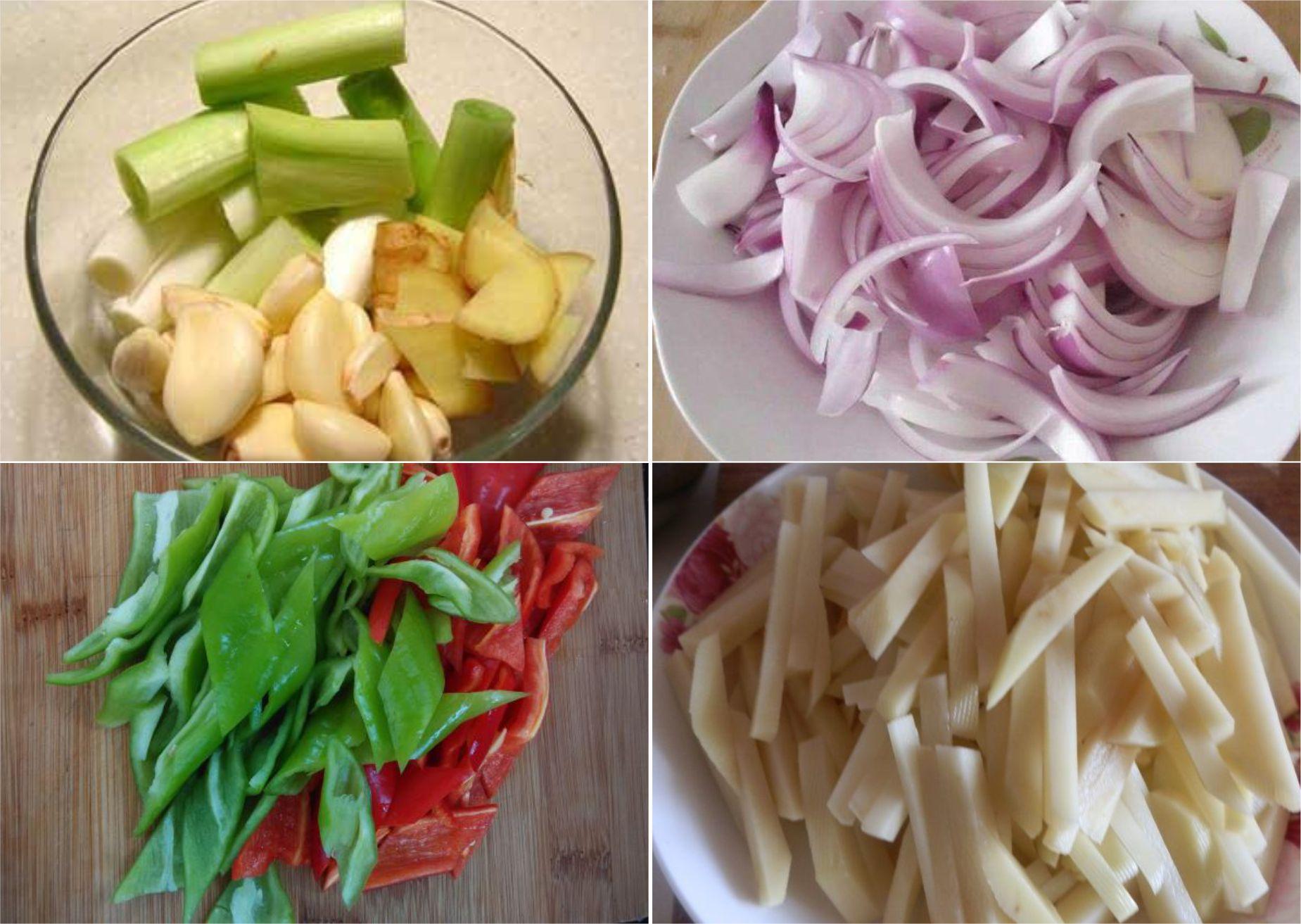 2、洗净的葱切段,姜、蒜、青红辣椒切片,洋葱切丝,土豆去皮切条待用;