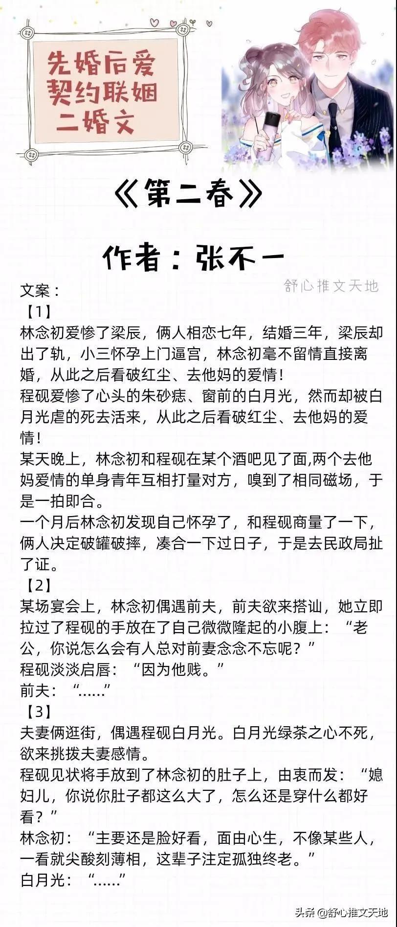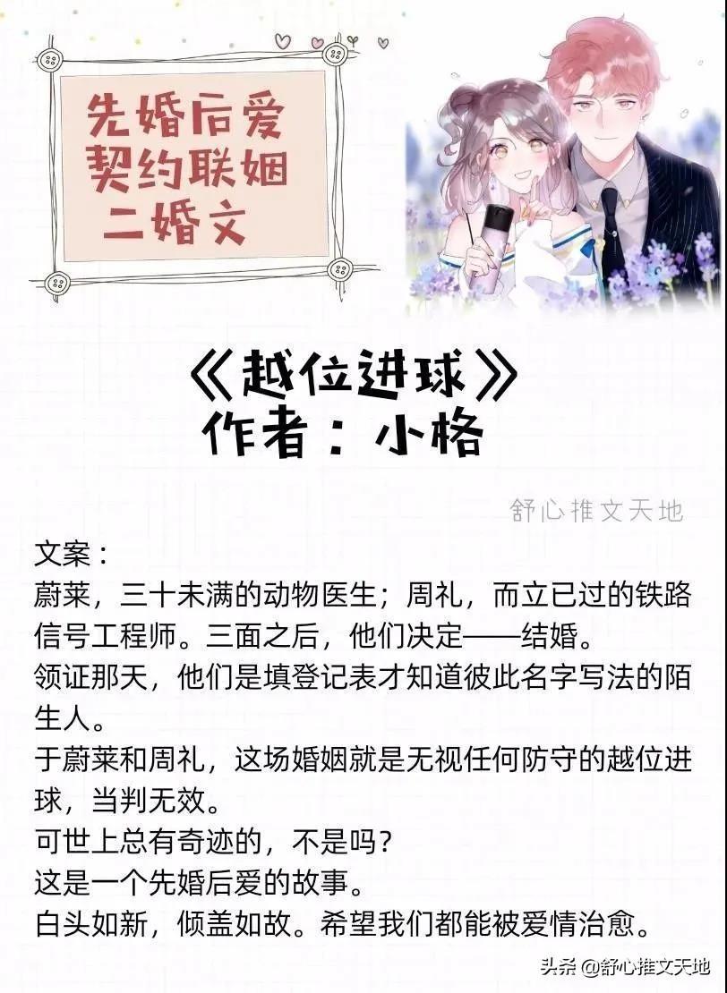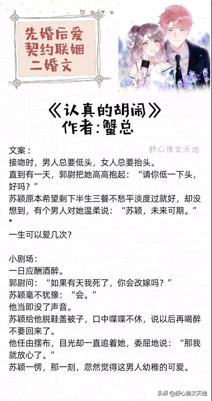 先婚后爱,契约联姻,离婚遇真爱二婚文等,喜欢婚恋文的不要错过啦!书单一共两期。每期大概十部左右。