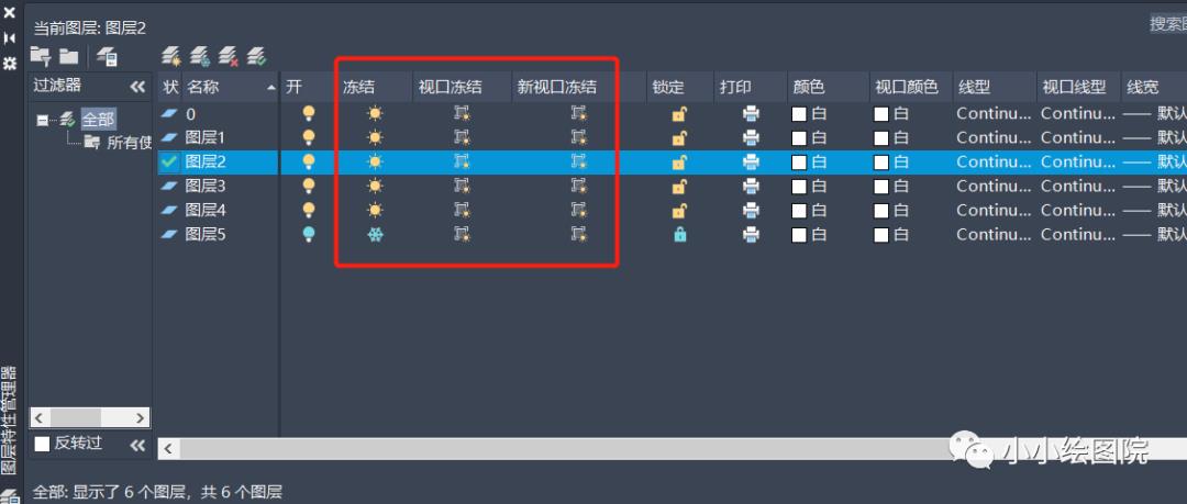 另外,冻结与视口也是有关联的。当我们在模型空间时,图层管理器中只有“冻结”一项,但如果在布局空间时,图层管理器则多出“当前视口冻结”和“新视口冻结”两列,如下图所示。