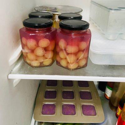 7、第二天取出后,这颜色爱了~每一瓶加入两勺葡萄皮水就是这个颜色了。