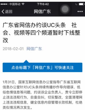 近日威名远播的“震惊部”终于被责令整改了,据广东省互联网信息办公室公告显示:UC头条违反国家有关互联网管理法律规定,持续传播炒作导向错误、低俗色情等信息,对网上舆论生态环境造成恶劣影响。已于1月31日,在国家互联网信息办公室指导下广东省互联网信息办公室针对UC头条持续传播炒作导向错误、低俗色情信息等问题,约谈该企业负责人,责令立即停止违法违规行为,自查自纠,切实整改,全面清理网上违法违规信息,健全信息内容管理长效机制,杜绝类似情况再次发生。