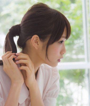 学生日常扎发发型中,也有很多将头发做成马尾辫扎发发型的。空气刘海双扎马尾辫发型,将额头上的发丝顺着头型梳空气感,两边头发分别梳好,高高的固定在耳尖位置。