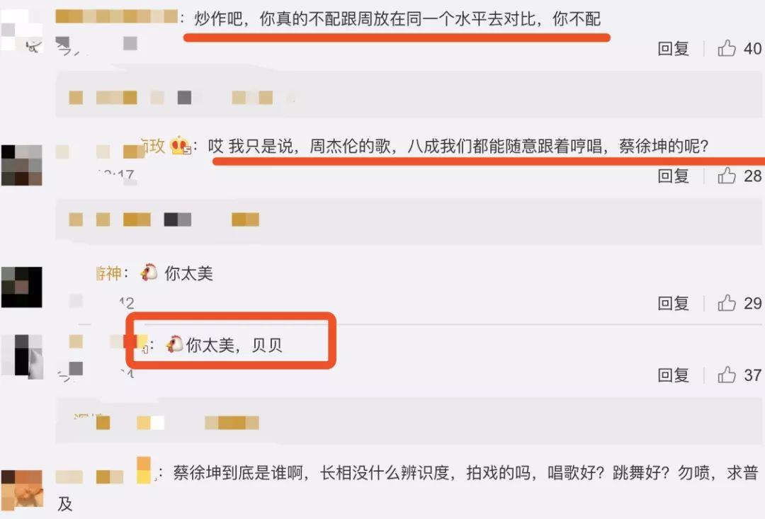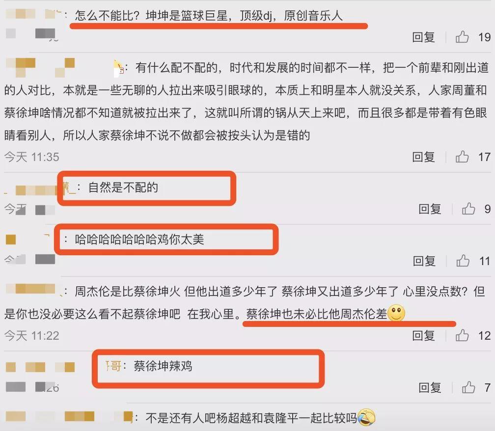 虽然广大网友都觉得蔡徐坤不配跟周杰伦比,但坤坤的一些粉丝也反驳说:“周杰伦出道这么多年了,是很火,但蔡徐坤未必比他周杰伦差。”