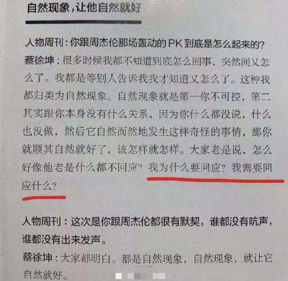 近日,蔡徐坤在接受某周刊采访时,谈到与周杰伦超话PK事件,称很多时候自己都不知道发生了什么事,所以把这些都归类为“自然现象”,因为“第一你不可控,第二其实跟你本身没有什么关系”。
