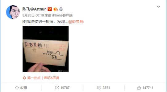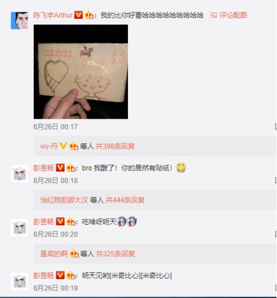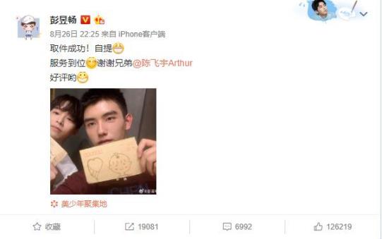 就在26日晚上十点多的时候,彭昱畅微博发出两人碰面,各自拿着自家粉丝送的信的合照。并配上文字“取件成功!自提,服务到位,谢谢兄弟@陈飞宇Arthur