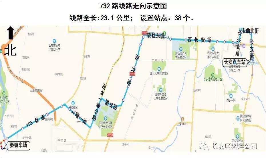 732路(长安汽车站——秦镇),该线路全长23.1公里,设置站点38个。配备14辆中型空调新型能源公共汽车。
