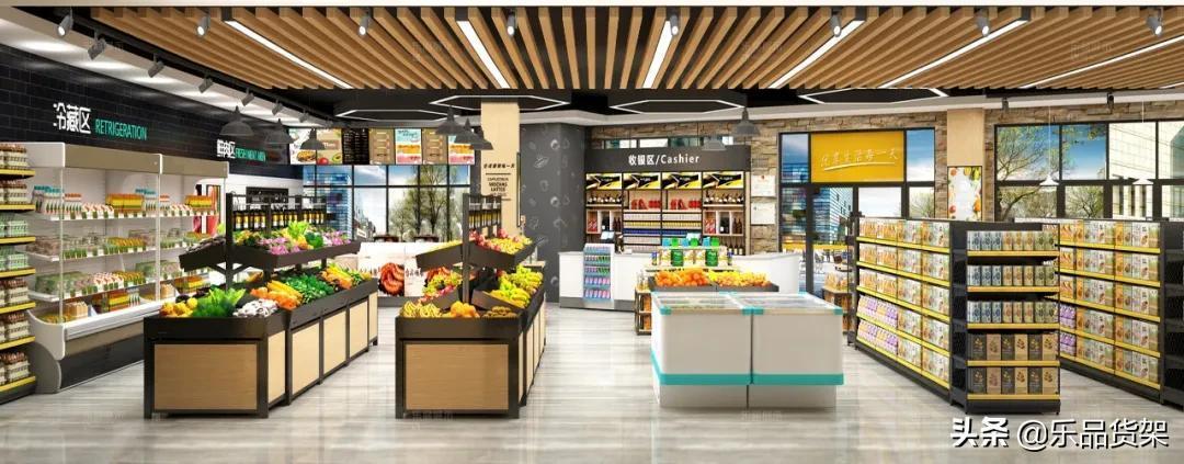 社区便利店+生鲜多元化,满足社区居民基本的生活需求。在生鲜区域设计上,乐品设计师选用钢木果蔬架,多层储物陈列设计,简单实用美观。