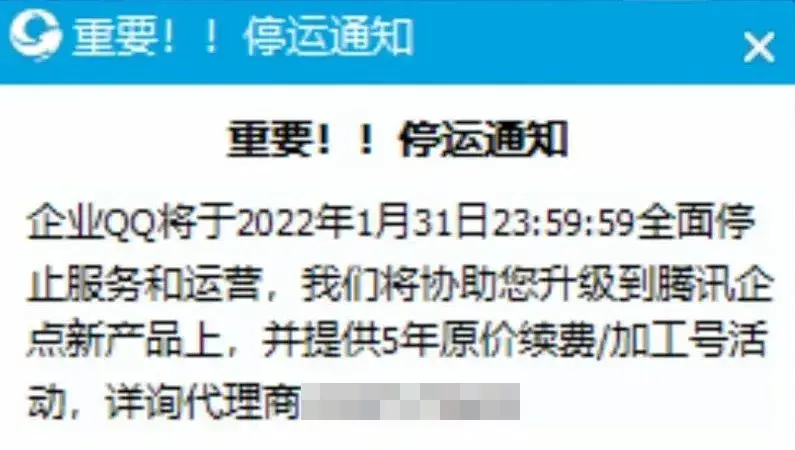 官方宣布:今年10月28日,企业QQ和营销QQ全面停止续费;明年1月31日,企业QQ和营销QQ全面停止服务和运营,届时用户将无法登录。
