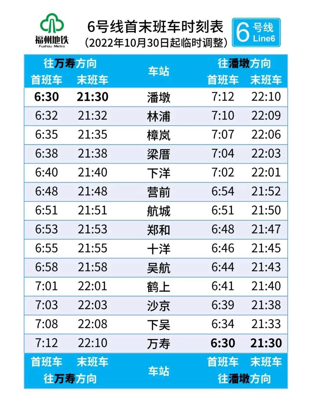 6号线调整为6:30~21:30。