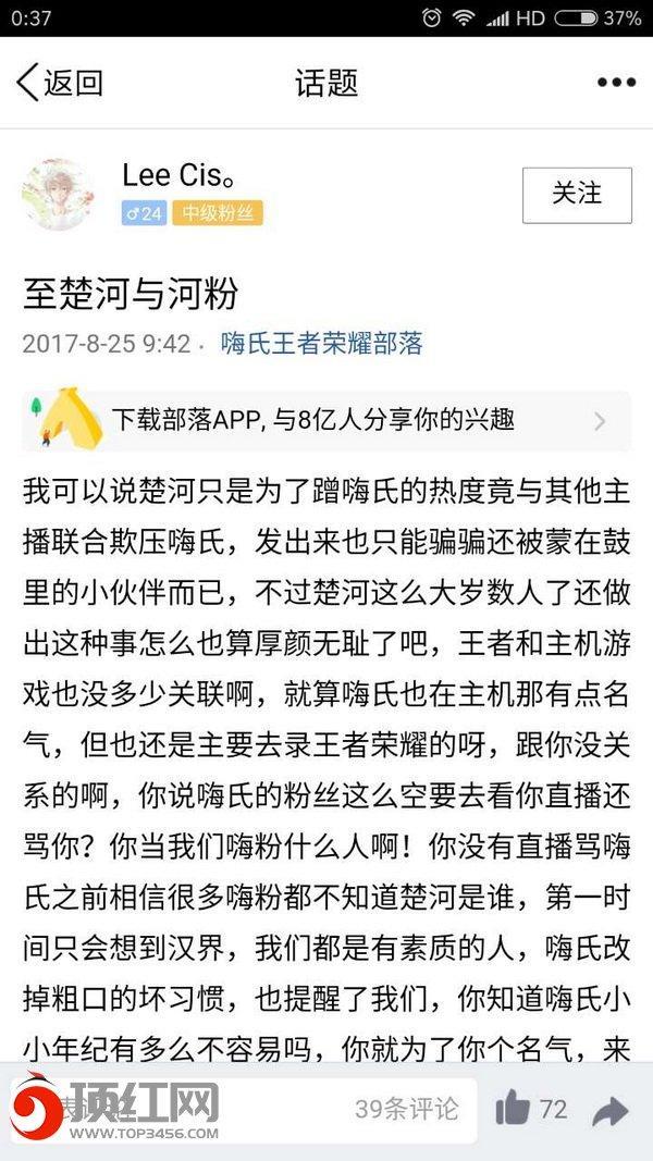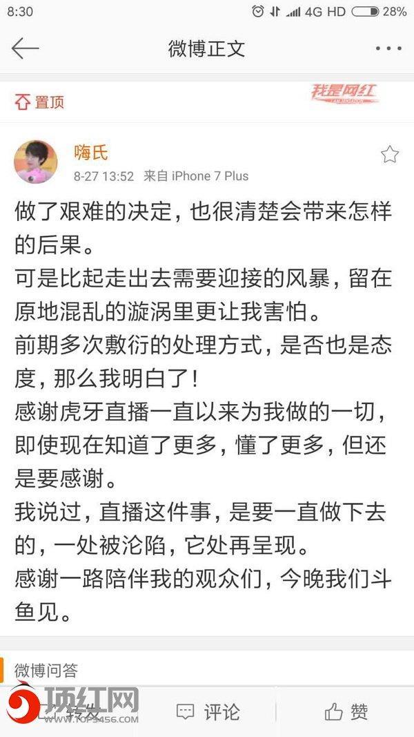 也有观战楚河嗨氏开撕的人说:“当初楚河和嗨氏开撕的时候,就有传言称他俩必须走一个,才能平息这场大战,这是不是预告?”还有人帮着嗨氏说话,嗨氏在虎牙这么收挤兑,还不如跳槽去斗鱼自在,可以安心的打游戏了。