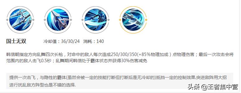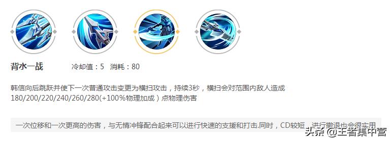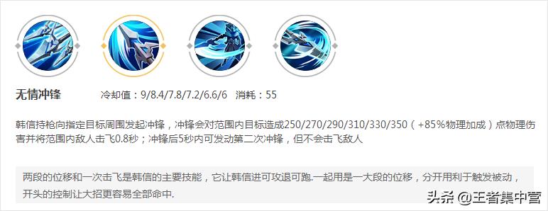 要注意的是二技能是反向技能,是技能指向方向的反方向跳跃,面临逃脱撤离的情况使用就很合适,如果要用在追杀的情况下,就要注意这个技能的方向,导致追杀变远离了。韩信这个位移可以说王者中所有的墙都可以穿过,只要方向是正确的,非常实用的技能