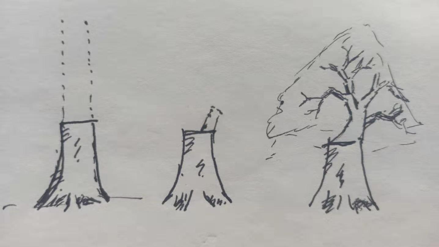 一种方法是直接把主干剪短了,只留下2,3厘米做主干,然后在顶部留枝作为顶枝。如下图: