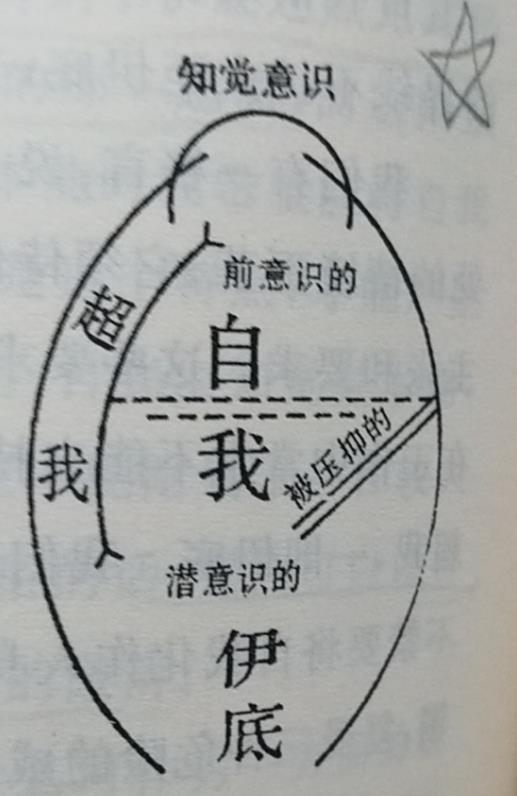 《自我和本我》是我们常用到的本我(id或伊底)、自我(ego)、超我(super-ego)三个词的来源,三者的关系用作者自己的图展示如下,这里不是一句两句能说清的事儿,至于这种“胆大妄为”的理论的证明,我们还是交给未来的解刨学吧:
