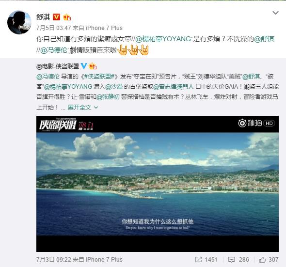 舒淇与冯德伦的感情究竟有没有问题?小编看了舒淇的微博,发现从6月底至今,舒淇与冯德伦的互动频繁,互动内容多是关于电影《侠盗联盟》的。