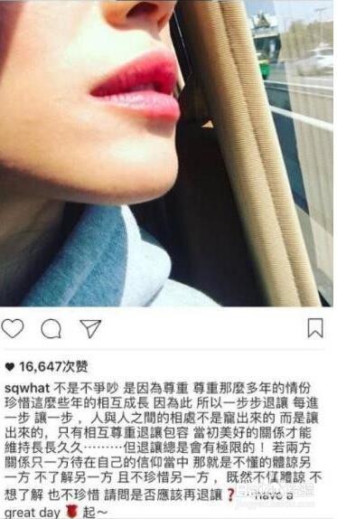 后来,她又在ins上写道:“不是不争吵,是因为尊重,尊重那么多年的情份,珍惜这么些年的相互成长。因为此,所以一步步退让 ,每进一步让一步,人与人之间的相处不是宠出来的,而是让出来的,只有相互尊重退让包容,当初美好的关系才能维持长长久久⋯⋯⋯但退让总是会有极限的!若两方关系只一方待在自己的信仰当中 那就是不懂的体谅另一方,不了解另一方,且不珍惜另一方,既然不懂体谅 ,不想了解, 也不珍惜 ,请问是否应该再退让?⋯have a great day”。