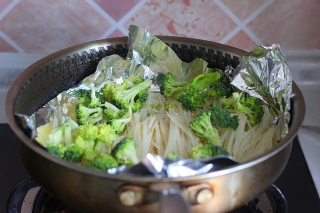 4、平底锅放入一张锡纸,刷上一层油,放入土豆片,金针菇和西蓝花。
