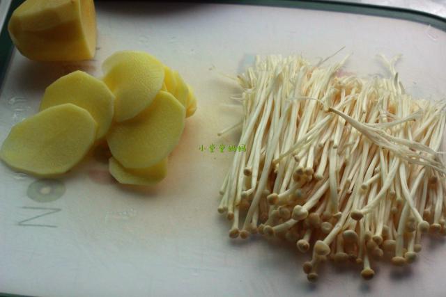 3、下面开始做配菜,土豆切片,金针菇切掉尾部,撕开,西蓝花掰小朵,洗净。