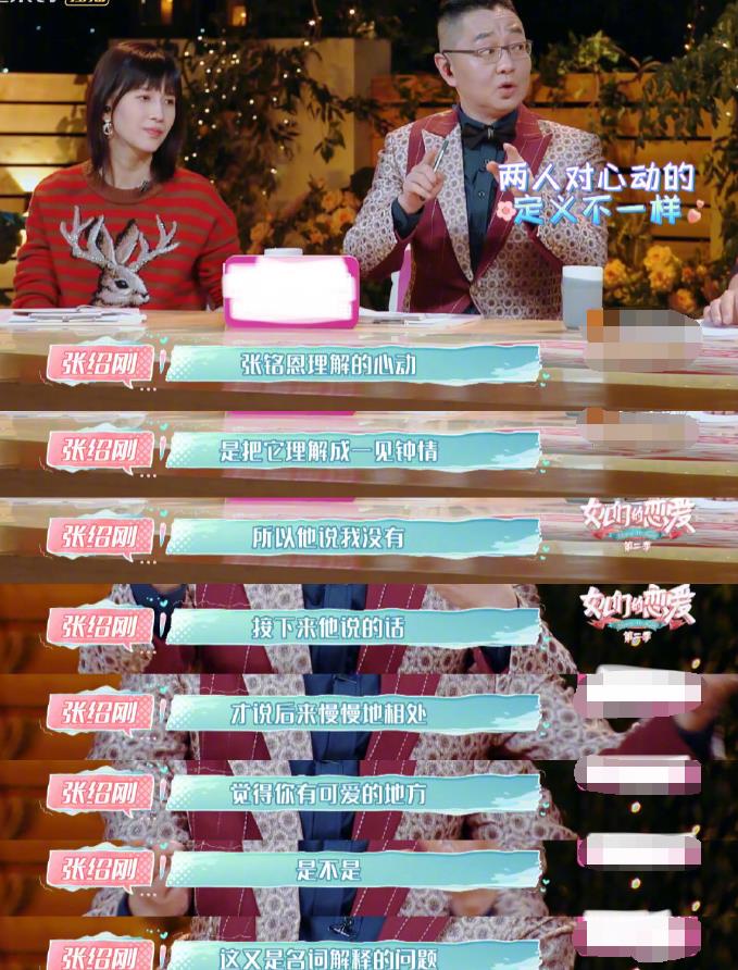看到这段张绍刚老师解释说这应该是名词解释的问题,因为两个人对心动的定义不一样张铭恩理解的心动可能是一见钟情,所以才会一直强调自己没有心动过。