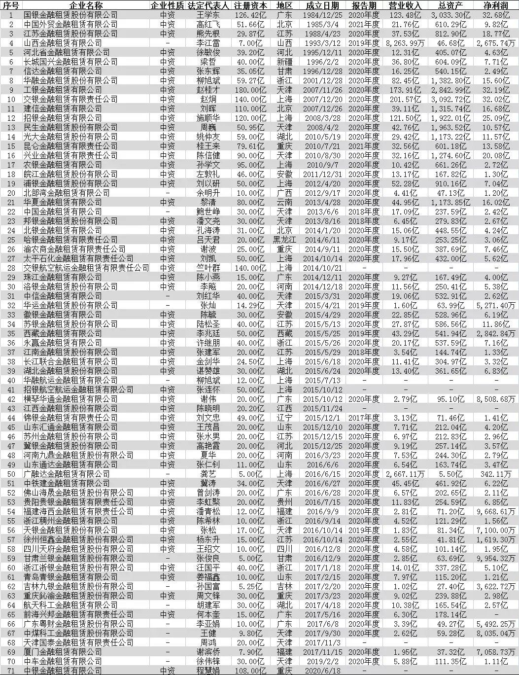 全国71家金融租赁公司名录