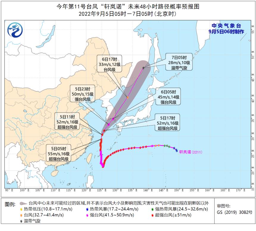 今晨,“轩岚诺”转为向北偏东方向移动,强度维持超强台风级(16级,55米/秒)。预计未来“轩岚诺”强度将逐渐减弱,并于今天白天转向东北方向移动,6日早晨到上午登陆或擦过韩国南部沿海,之后进入日本海向东北方向快速移动并逐渐变性为温带气旋。