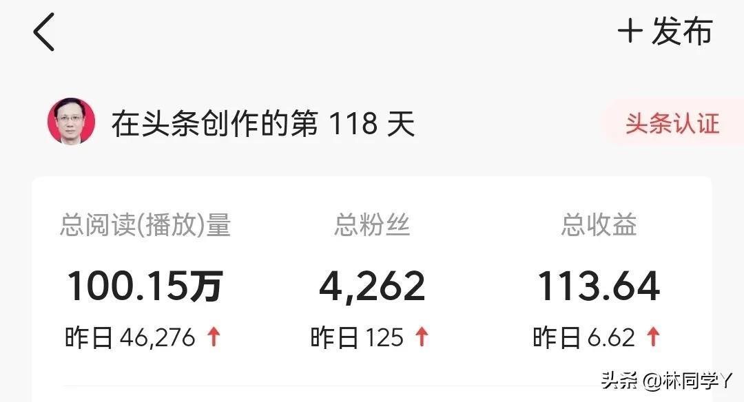 今天,是我注册今日头条118天,终于完成了100万总阅读(播放量)。我完成100万总阅读(播放量)用了118天。净增总粉丝4662人,总收益:113.64元。
